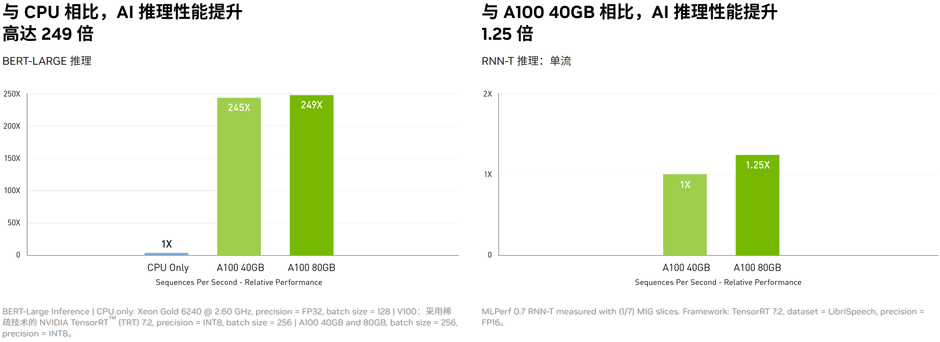 在受到批量大小限制的极复杂模型(例如用于自动语音识别用途的 RNN-T)上,显存容量有所增加的 A100 80GB 能使每个 MIG 的大小增加一倍,并提供比 A100 40GB 高 1.25 倍的吞吐量。